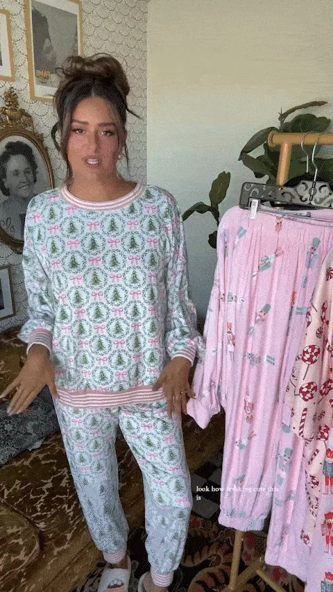 Get in the holiday spirit with our Christmas Trees and Bows Pajama Set. Made of luxurious fabric, this set features charming Christmas trees and playful pink gingham bows. Perfect for cozying up during the holidays.