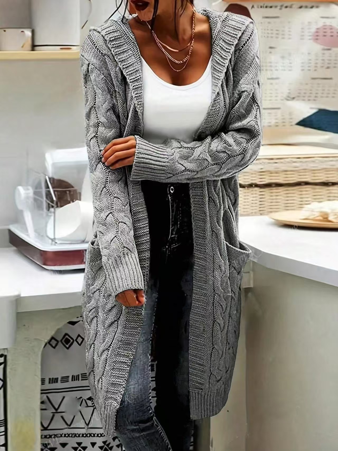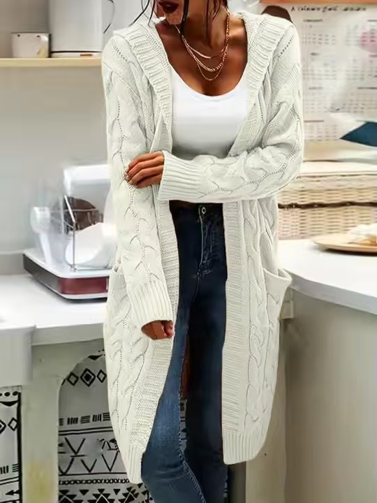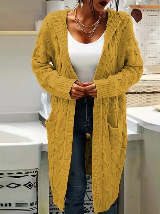 【Mid-length Cut】: The mid-length design provides a flattering silhouette while offering added warmth during the fall and winter seasons.【Hooded Feature】: The hoodie adds a layer of protection against chilly winds, enhancing the practicality of this knitted outerwear.【Knit Texture】: Crafted from a moderate-thickness fabric, this sweater cardigan offers a soft, cozy feel suitable for layered outfits.【Button Detailing】: Features decorative button details that enhance the visual appeal while maintaining a simple, refined appearance.【Spacious Pockets】: Equipped with roomy pockets, providing a convenient place to store small essentials while on the go.