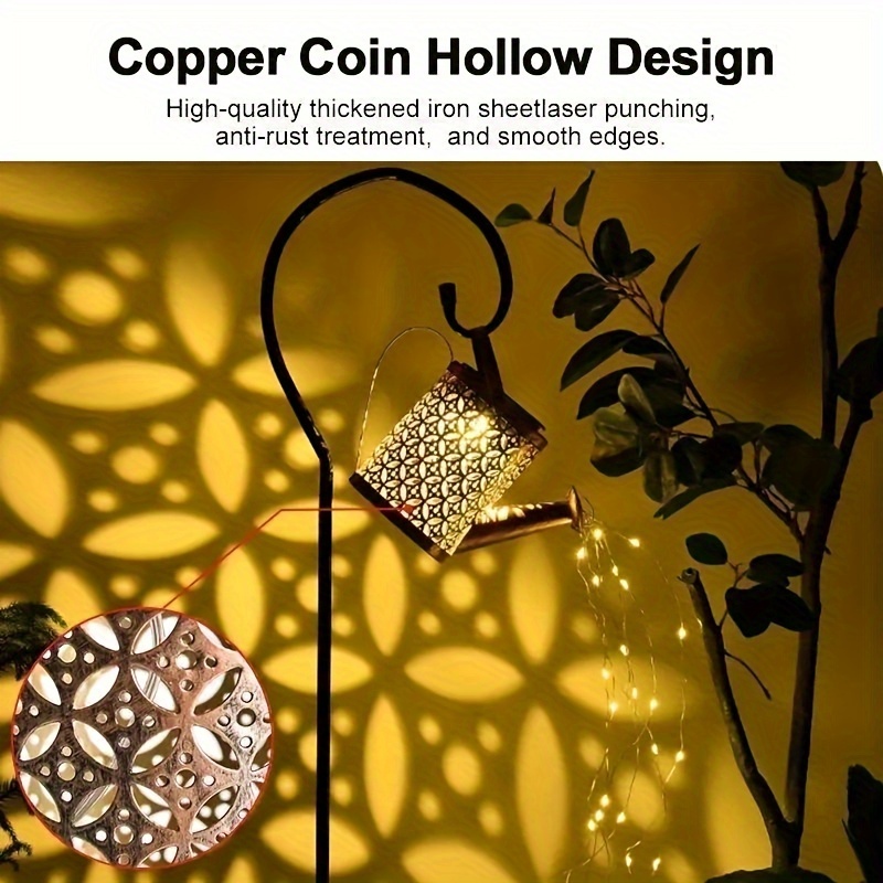 【Small Garden Decorative Light】 Solar watering can lights (with shepherd hook) comes with 6 strands of LED flashing string lights (60 LEDs), the light cord is 17.7 inches long and can be easily bent and shaped into any shape you like, perfect for DIY. These lamp beads will light up at night, beating and twinkling like flowing stars. The built-in high-brightness LED bulb amplifies the hollow pattern and projects it onto the ground and surroundings, creating a romantic atmosphere.